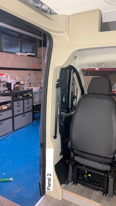 2: Cut the 2 inch drop off the black plastic shelf above the cab headlining before fitting panel #1.